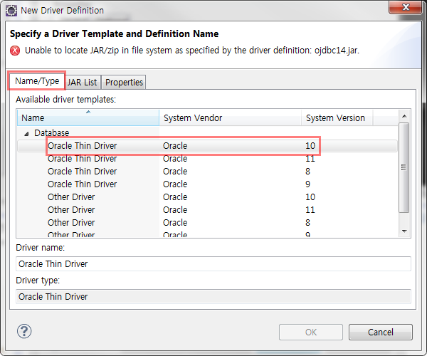 Name/Type 탭에서 Oracle Thin Driver에서 오라클 버전 맞는 것을 선택합니다.