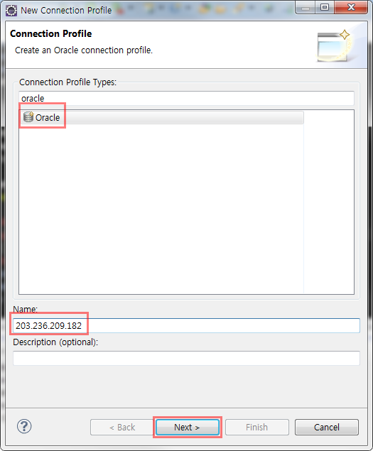 Oracle 선택하고 아래에 이름을 입력하고 Next 클릭합니다.