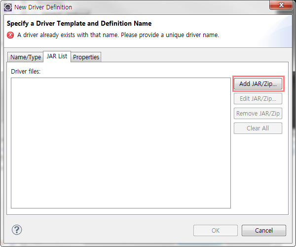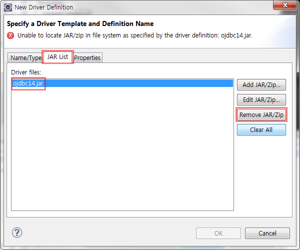 JAR List 탭에서 ojdbc14.jar 파일 선택하고 Remove JAR/Zip 클릭하여 지워줍니다.